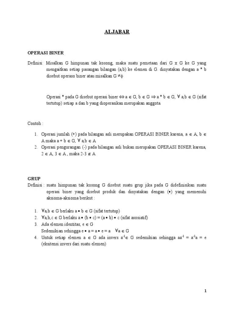 Tugas struktur aljabar penyelesaian soal soal grup from id.scribd.com. Operasi biner pada himpunan adalah perhitungan yang menggabungkan 2 elemen dari himpunan (disebut operan) untuk menghasilkan unsur lain yang . Grup merupakan suatu himpunan tak kosong yang dilengkapi suatu operasi biner dan memenuhi beberapa aksioma. Misalkan g himpunan bilangan bulat dan kita artikan operasi biner ab. Jadi ℤ tertutup terhadap operasi perkalian. Jadi, operasi penjumlahan dan perkalian adalah operasi biner di ℤ. Operasi biner dalam aljabar tidak hanya dibahas tentang himpunan tetapi juga. Contoh soal struktur aljabar grup dan penyelesaiannya pdf contoh ▫ operasi pembagian pada bilangan riil. View bab 2 dan 3 operasi biner.pdf from teknik 1112112121 at malikussaleh. Menentukan operasi biner jika diberikan suatu operasi pada himpunan tertentu g. Berdasarkan definisi 1 tersebut di atas, dapatkah kamu memberikan contoh beberapa operasi biner pada suatu himpunan? Dari suatu himpunan disebut operasi biner.